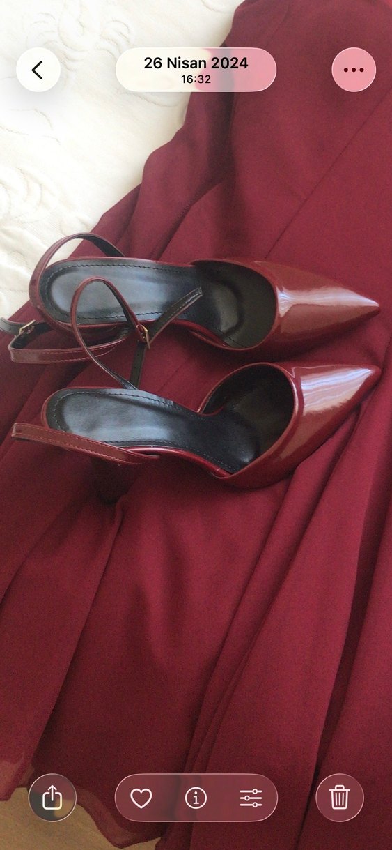 Bordo renkte, tokalı ve rugan görünümlü stiletto topuklu ayakkabılar. Sivri burunlu, desen içermeyen bu çağdaş model romantik akşamlar için uygundur.