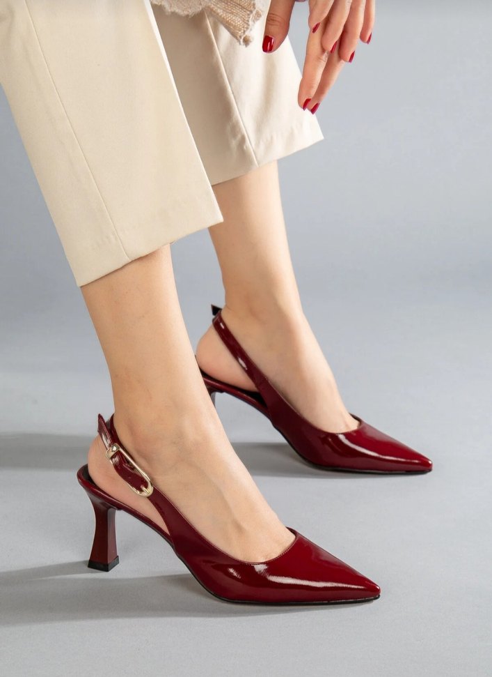 Bordo parlak rugan görünümlü, tokalı kayışa sahip sivri burunlu stiletto topuklu ayakkabı. Ofis kullanımı için uygun, çağdaş klasik tarzda.