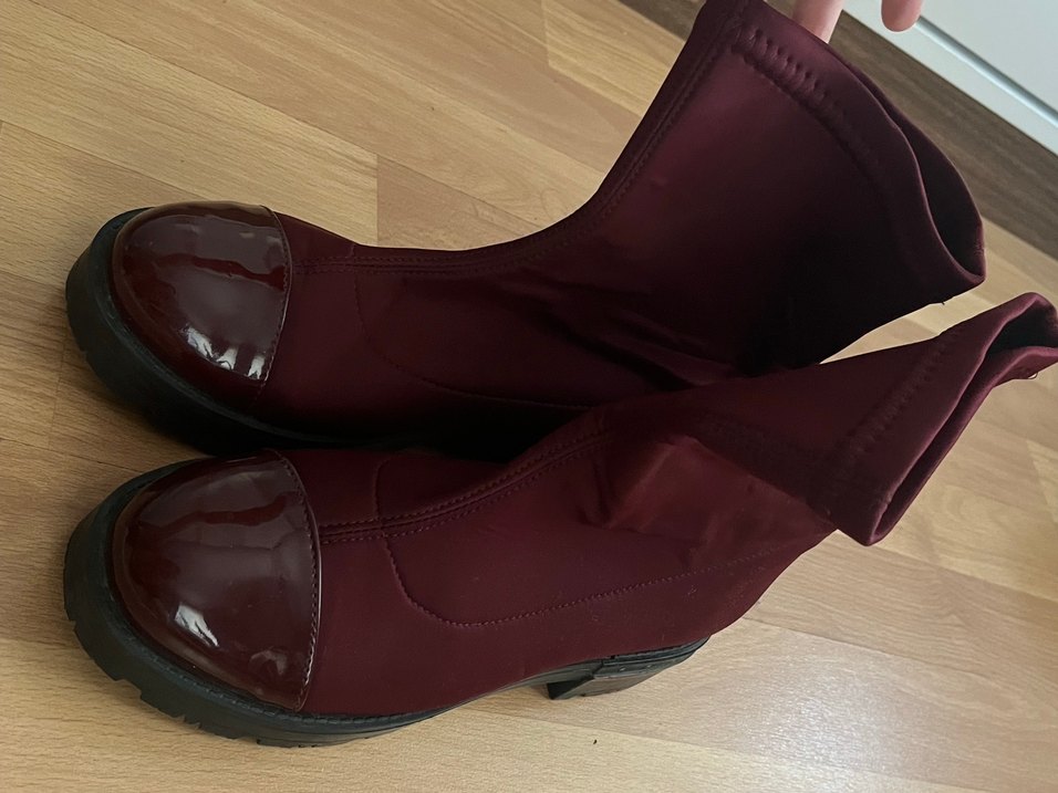 Bordo renkli, lastikli ve rugan uçlu ince topuklu kadın botu. Gotik tarzı ve Paris etkisiyle günlük kullanıma uygun.