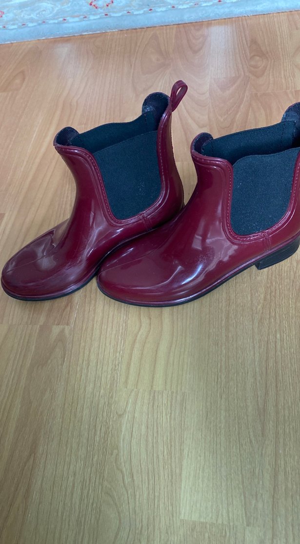 Bordo parlak rugan görünümlü,, minimalist tarzda kadın botu, kauçuk malzemeden üretilmiştir. Ürün gayet iyi durumdadır yenidir su geçirmez ürün iademizde yoktur