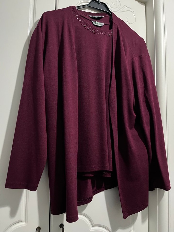 Bordo renkli, salaş kesim, uzun kollu ve yuvarlak yakalı hamile hırka ve kazak takımıdır. Midi boyda, dökümlü tasarımı ve yumuşak kumaşıyla günlük kullanıma uygundur.