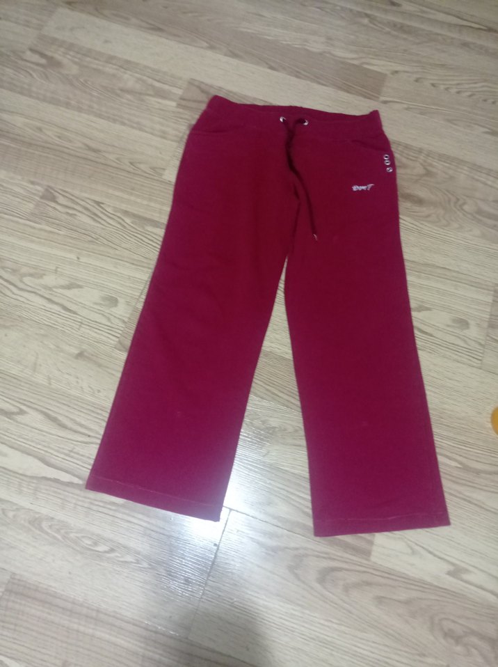 Bordo renkli, salaş kesim, normal midi boyda kadın eşofman altı. Yumuşak ve sıcak kumaştan, rahat ve şık athleisure tarzı için uygun. yazılı kısım altında minik bir renk atma lekesi var bir de paça dikisleri biraz defolu Baska sorunu yoktur