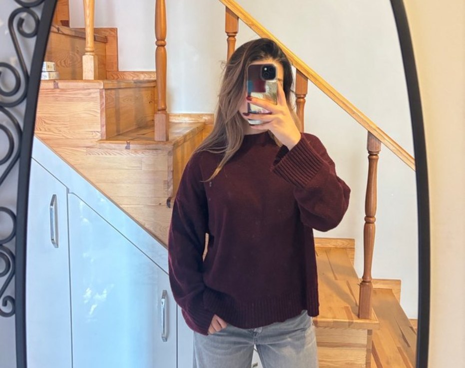 Bordo renkte, yün kumaştan, yüksek yakalı ve uzun kollu, salaş kesim midi uzunlukta kadın kazak. Günlük kullanım için rahat ve şık.