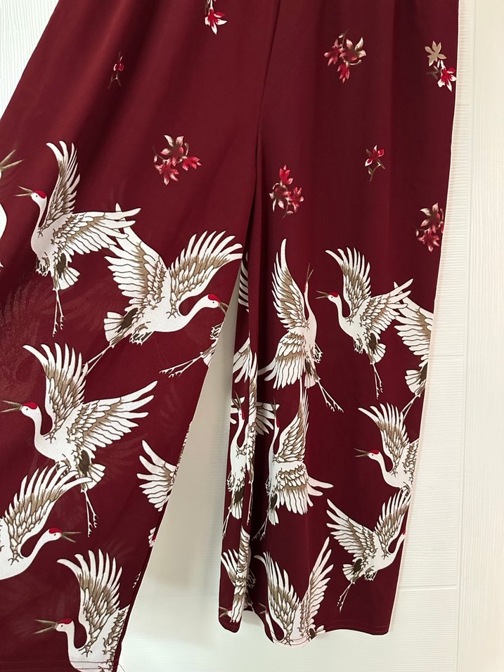Bir kez giyildi Bordo renkli, ipeksi kumaştan, nakışlı kuş desenli, salaş kesim ve drapeli kadın pantolon, bohem tarz ve düğünler için uygundur.