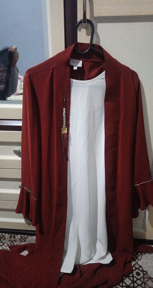 Bordo, parlak ve ipeksi kumaştan salaş kesim midi hamile kabanı. Uzun kollu ve yakası kesik detaylı, püskül süslemelidir. Günlük kullanıma uygun 3 parça sıfır