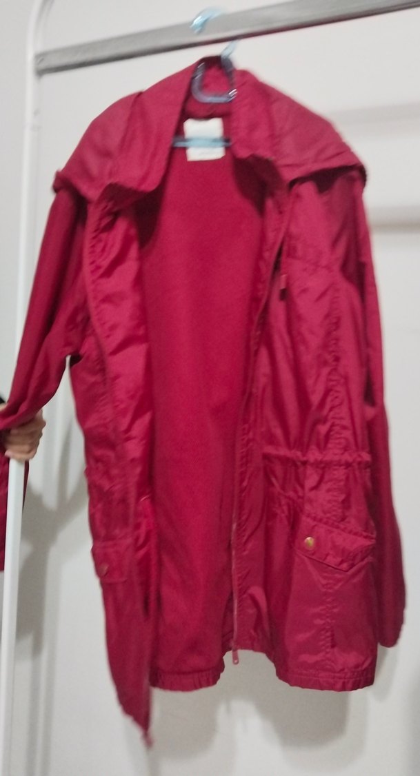 Bordo renkli, parlak sentetik kumaştan, salaş kesim ve drapeli tasarıma sahip kadın ceket. Uzun kollu ve yaka detaylı, gündelik kullanıma uygun.