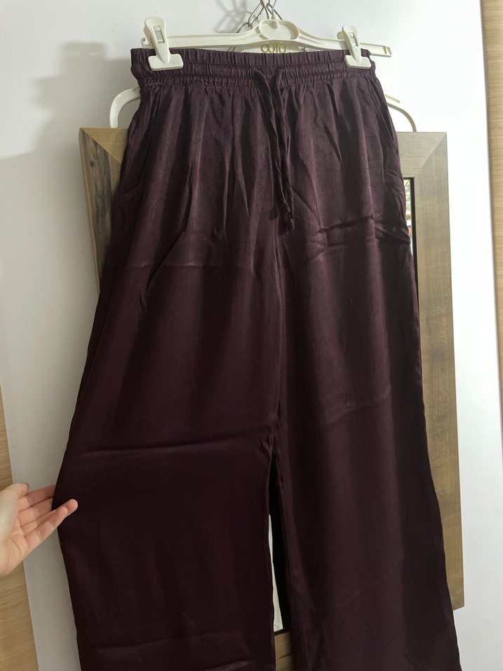 Bordo renkte, saten dokulu, salaş kesim midi pantolon, drapeli tasarımıyla günlük kullanıma uygundur.