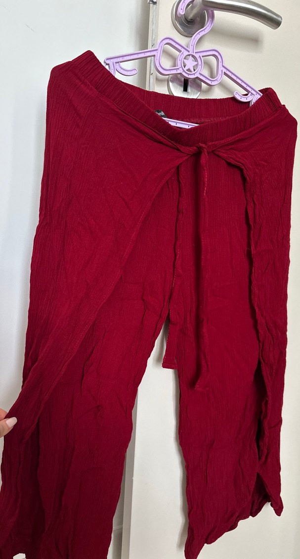 Salaş kesim, keten kumaştan bordo midi pantolon. Drapeli tasarımı ve bohem tarzıyla romantik akşamlar için uygundur.