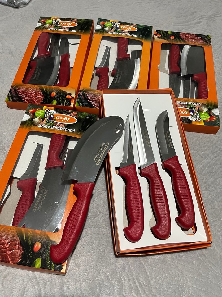 Bordo saplı, paslanmaz çelik bıçaklardan oluşan 3 parçalı mutfak bıçak seti, farklı kesim işleri için uygundur.