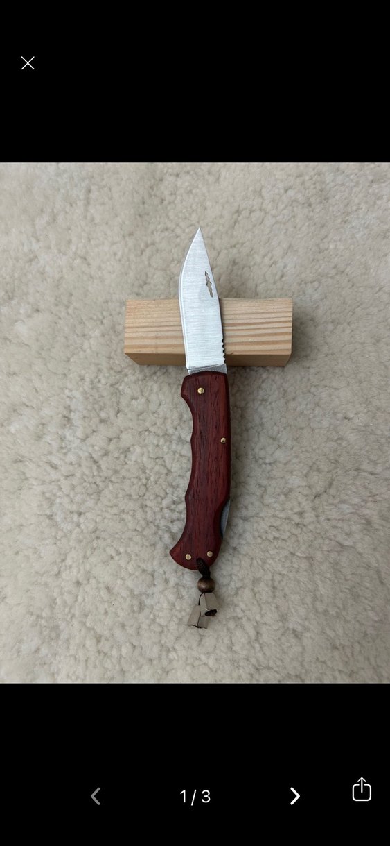 Bu katlanır bıçak, bordo renkli ahşap sap ve keskin paslanmaz çelik bıçağa sahiptir. Sap ucunda küçük bir anahtarlık süsü bulunur.