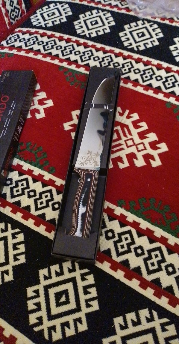 Bordo renk saplı, dekoratif desenli bıçak, siyah kutusunda şık bir sunumla. Kesme işlemleri için uygundur.