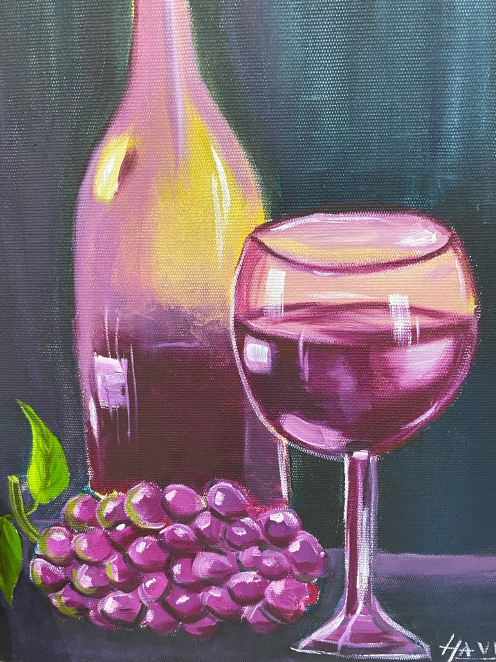 Bordo renkli yağlı boya tablo, şarap şişesi, dolu şarap bardağı ve bir salkım üzüm gösteriyor. Zengin tonlar ve yansımalar dikkat çekiyor.