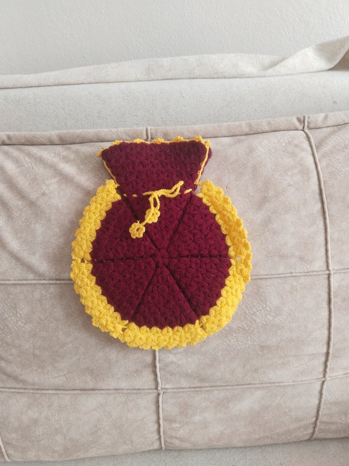 Bordo renginde, sarı nakış detaylı, yuvarlak şekilli ve bağcıklı banyo lifi renkleri bulunur