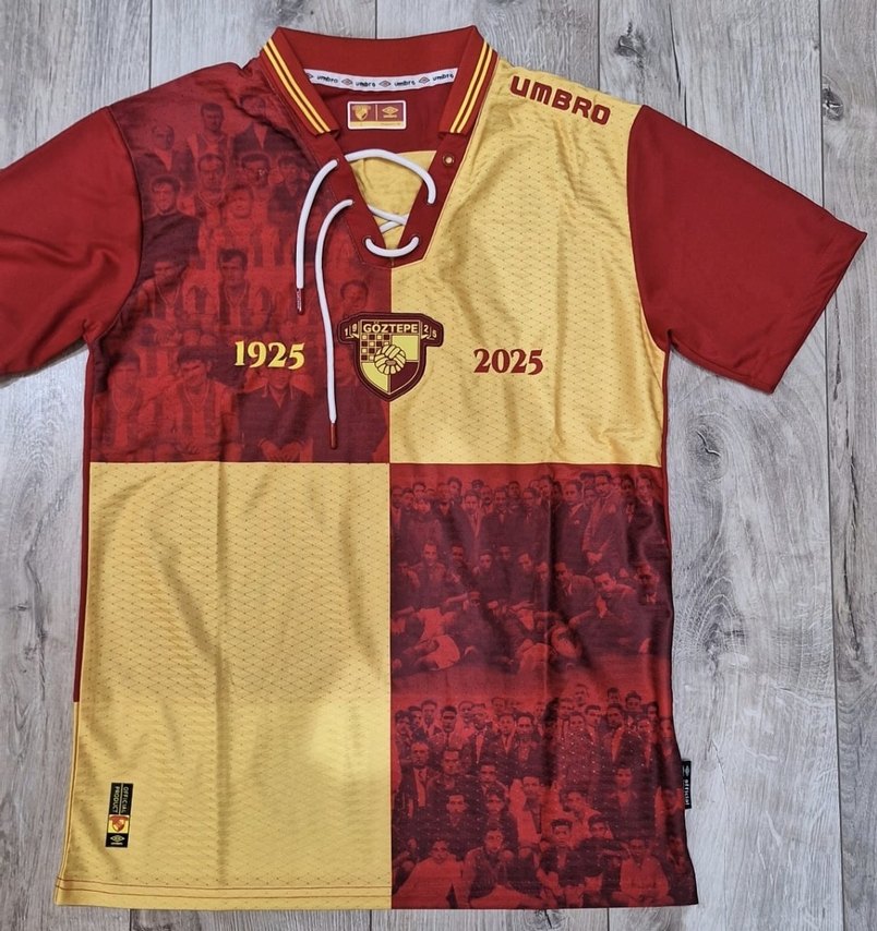 Bordo ve sarı renklerde, sentetik kumaştan, kısa kollu, düğmeli yakalı, bol kesim spor tişört. Üzerinde 1925, 2025 rakamları ve Umbro baskıları bulunur. ♂️