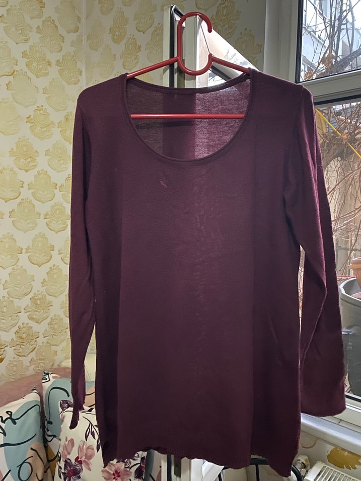 Bordo renkli, saten dokulu, yuvarlak yakalı, uzun kollu, bol kesim ve normal midi boyda hamile bluzu, günlük kullanıma uygun şık ve sade tasarım.