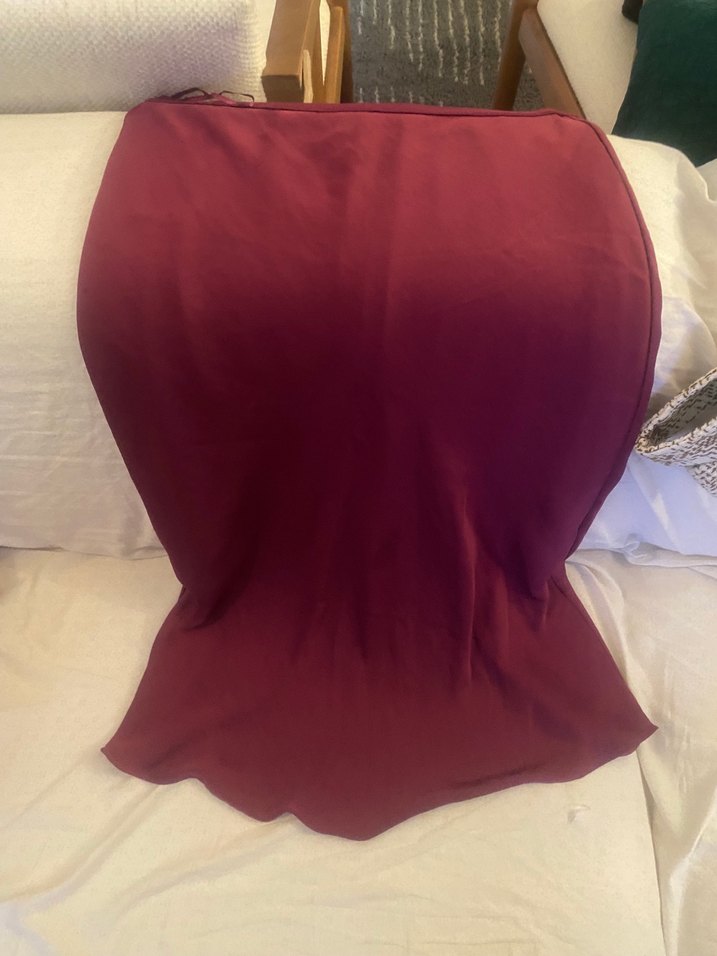 Bordo renkte, saten dokulu ve dökümlü uzun etek. Minimalist bohem tarzıyla romantik akşamlar için uygundur.