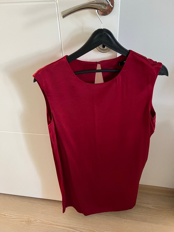 Bordo renk, kolsuz ve saten kumaştan yapılmış bu bluz, drapeli detay ve yuvarlak yakaya sahiptir. Günlük kullanıma uygun, şık ve minimal bir tasarımdır.