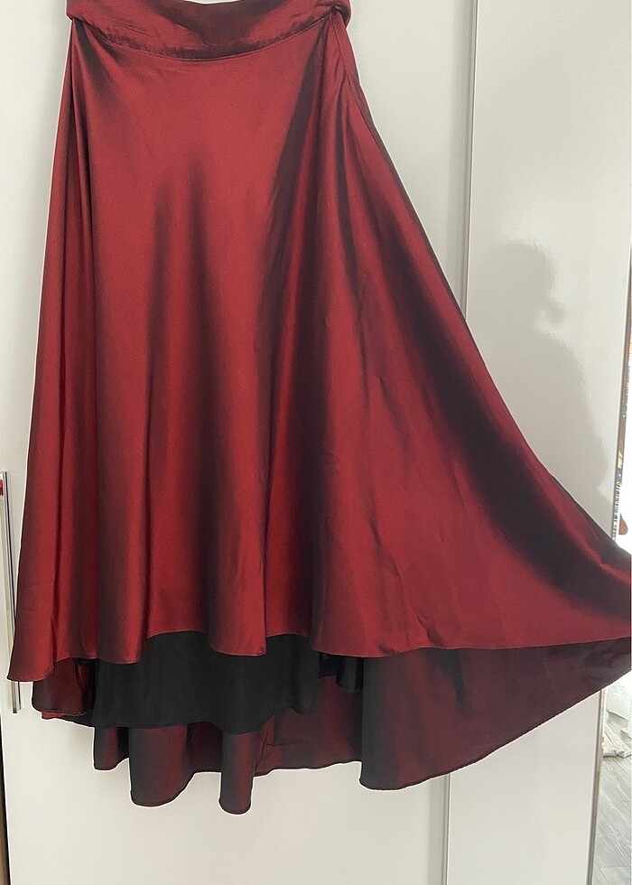 Saten, önü hafif kısa arkası daha uzun bir etek. Biraz yanardönerli bir kumaşı var, bordolu siyahlı bir kumaş. Astarlıdır. Önü 90 cm, arkası 117 cm. Bel 88 cm, basen 115 cm 42-44 beden uyumludur. Özel dikim. Bir kez giyildi, bir sıkıntısı yok