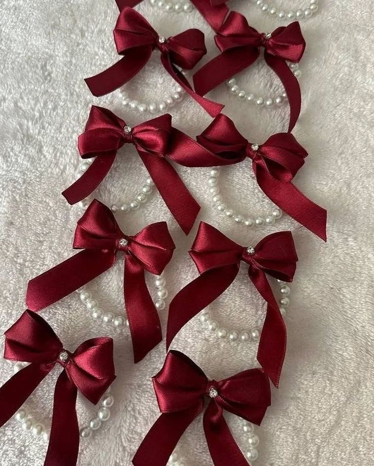 Parlak bordo, saten görünümlü kumaştan yapılmış, küçük taş detaylı klasik ve şık saç fiyonkları. toplu sipariş alıyorum