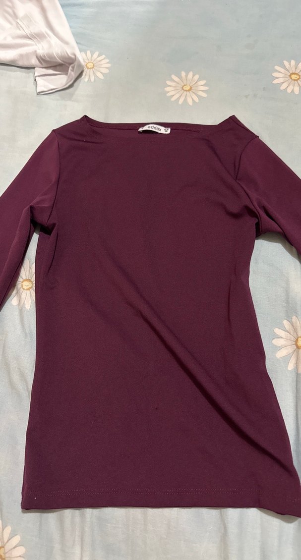 Bordo renkli, saten görünümlü uzun kollu kadın tişörtü. Yuvarlak yaka ve vücuda oturan normal boy midi kesime sahip, minimal ve sade tarzda, günlük kullanıma uygun.