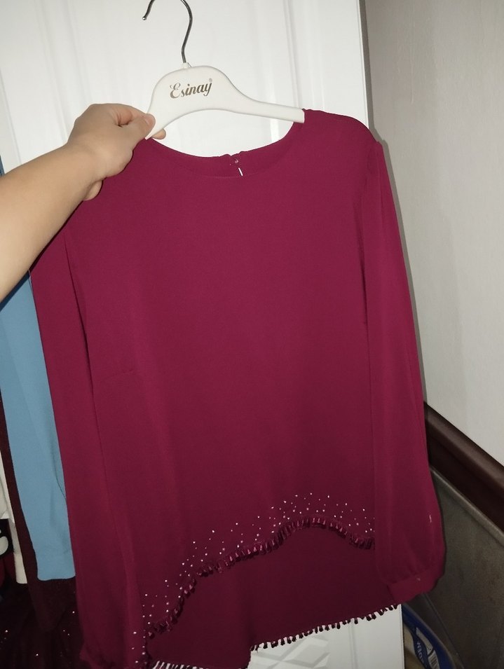 Bordo renkli, saten kumaştan yapılmış, uzun kollu ve salaş kesim hamile bluzu. Drapeli tasarımı ve parlak dokusuyla günlük kullanıma uygun. Esinay markası.
