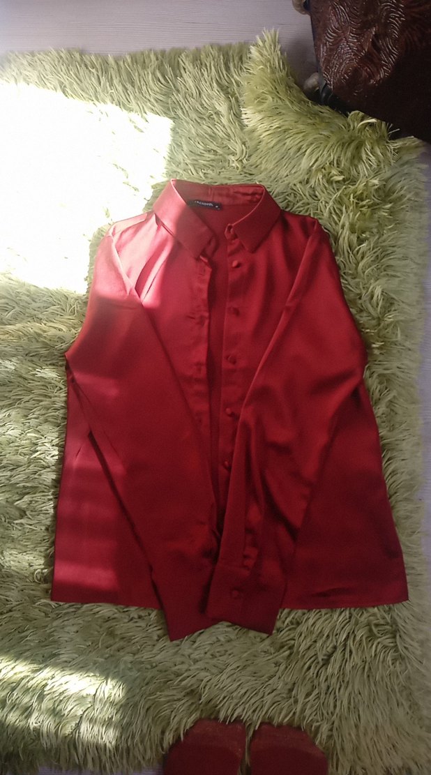 Bordo renkli, saten dokulu, yakalı ve düğmeli uzun kollu gömlek. Normal kesim ve minimalist tasarımıyla ofis stiline uygundur.