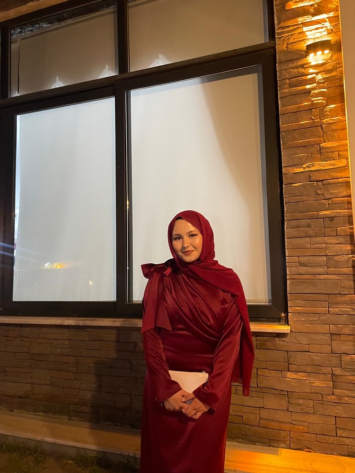 Kadınlar için saten dokulu, bordo renkli, drapeli şal. Minimalist ve mütevazı tarzlara uygundur.