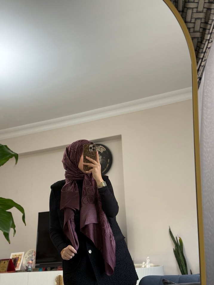Bordo renginde, saten dokulu ve drapeli kadın şal. Mütevazı ve rahat sokak stiline uygun, şıklık ve sıcaklık katıyor.