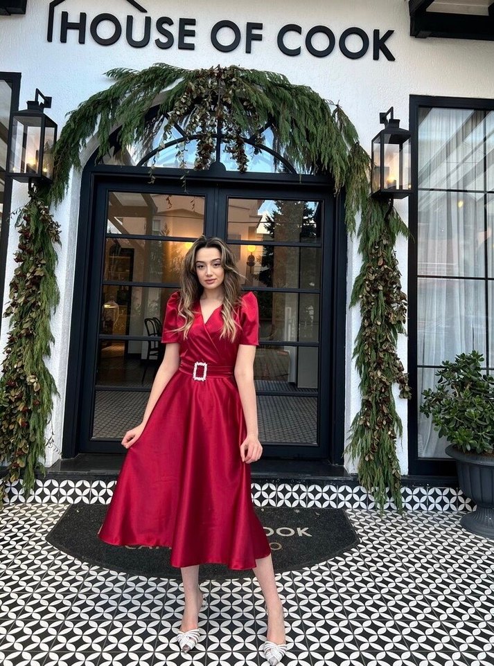 Kırmızı saten kumaştan, parlak görünümlü, V yakalı, kısa kollu ve kemerli bel detaylı uzun elbise. Düğünler için modern klasik tarzda, desen içermeyen, regular fit.