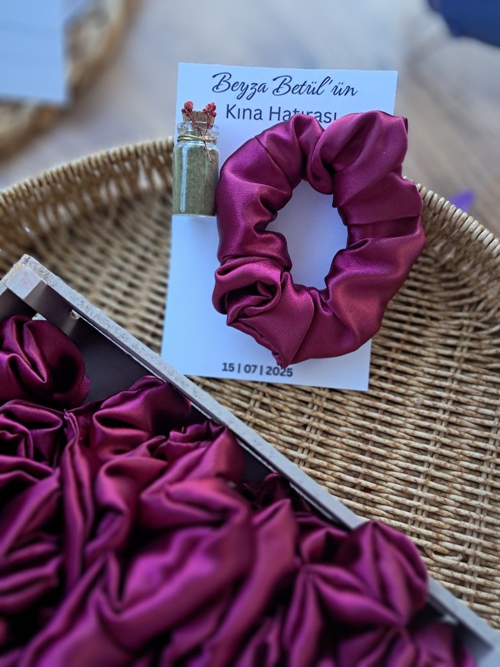 Parlak bordo saten kurdele detaylı, bohem ve rahat tarzda ipeksi saç tokası. Retro ve hippie stiller için uygun.