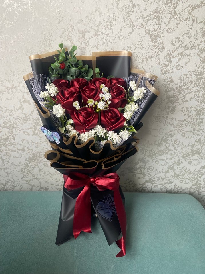 Özel günler için hazırladığım bu bordo gül buketi tamamen el emeğidir. Saten güller, zarif beyaz detay çiçekler ve şık siyah ambalaj ile premium bir görünüm sunar. Sevgililer Günü, doğum günü, yıldönümü ve sürpriz hediyeler için harika bir seçim. ✨ Detaylar: • El yapımı saten güller • Siyah & gold ambalaj • Bordo kurdele • Dekoratif aksesuar detayları • Uzun süre solmadan kalır İsteğe göre not eklenebilir.