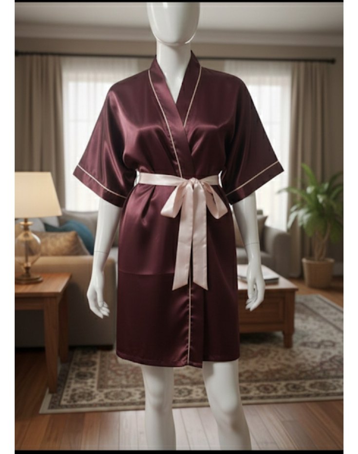 Bordo saten kumaştan, bol kesim ve askılı kollu, parlak görünümlü midi uzunlukta minimalist tarzda kadın sabahlık. Açık renk kuşak ile bağlanır.