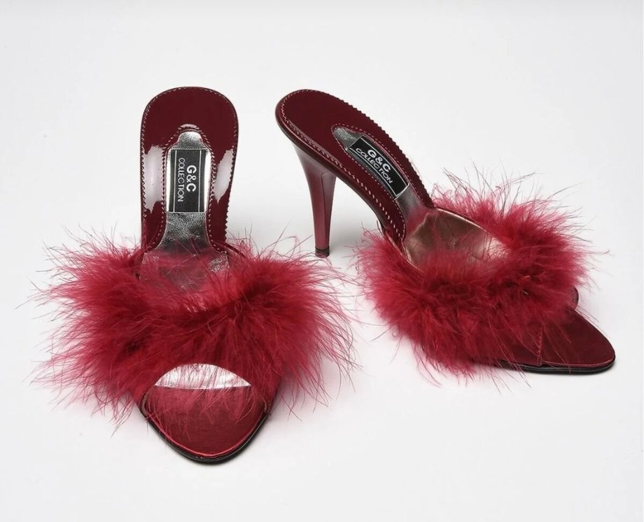 Bordo renkli, ipeksi saten malzemeden yapılmış, tüylü detaylı yüksek topuklu kadın terlikleri. Yüksek topuğuna rağmen gayet rahat