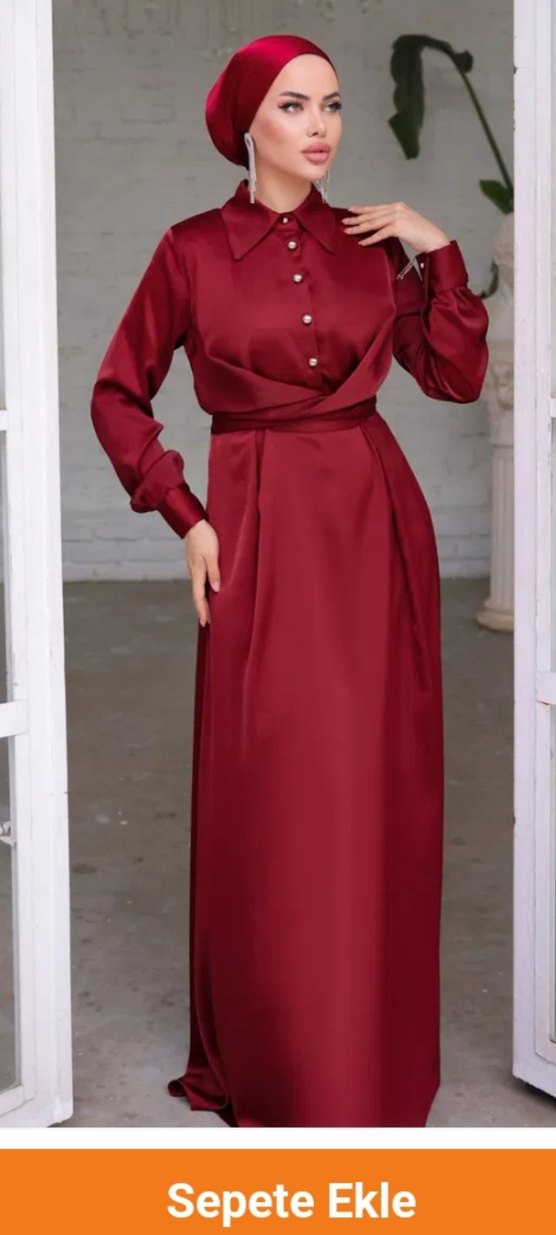 Bordo renkte, saten görünümlü uzun elbise, yakalı ve uzun kolludur. bir kez kullandım şuan olmadığı için satıyorum