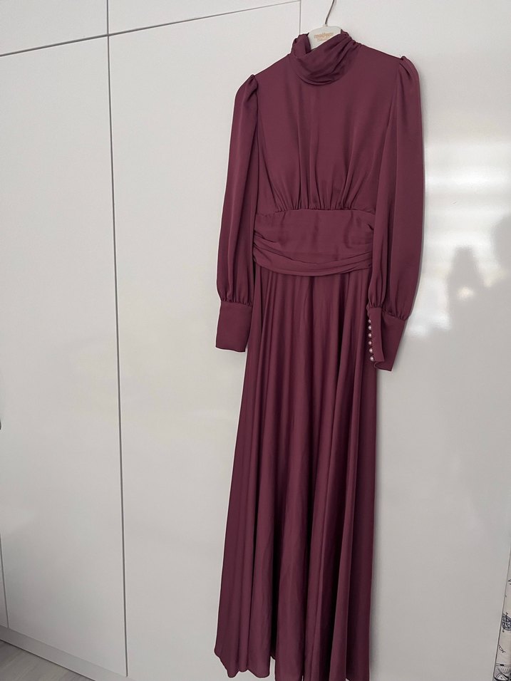 Bordo renkli, saten dokulu, yüksek yakalı ve drapeli detaylara sahip uzun kollu, vücuda oturan uzun elbisedir. Düğünler için uygundur.