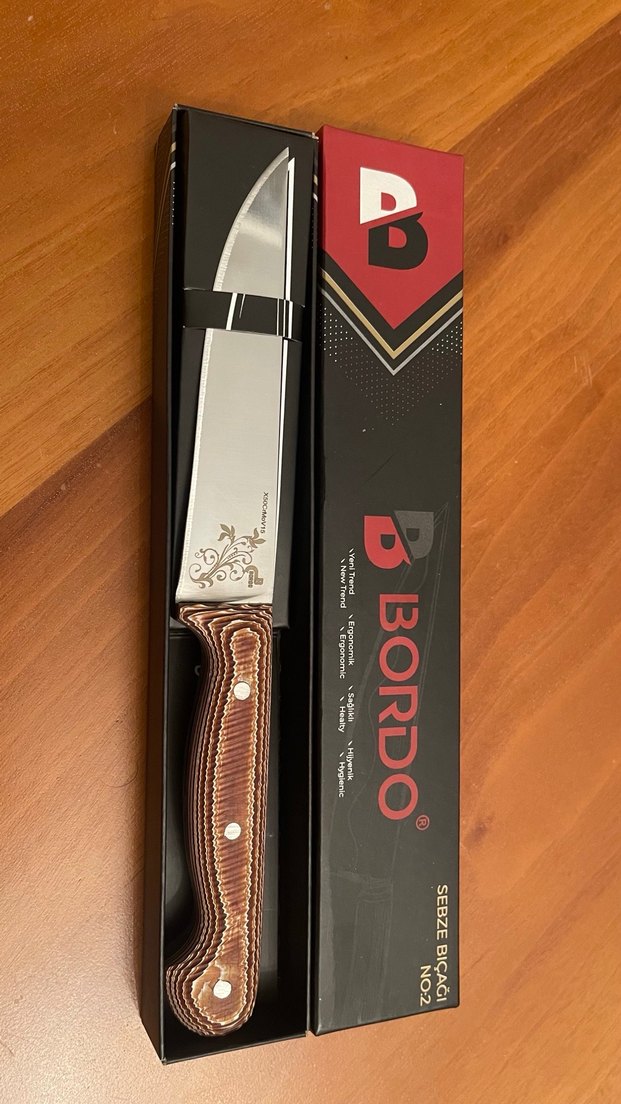 Bordo sebze bıçağı, dekoratif desenli keskin paslanmaz çelik bıçak ve kahverengi dokulu sap ile güvenli tutuş sağlar.