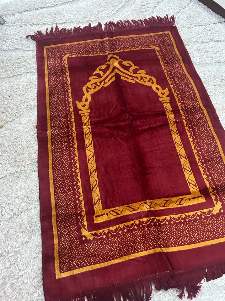 Püsküllü kenarları ve parlak nakış desenleri olan bordo geleneksel seccade .Detaylı altın işlemeleri bulunur.