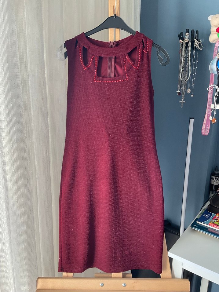 Bordo renkli, sıfır kol ve yüksek yakalı bu midi elbise, drapeli detaylarıyla romantik akşamlar için uygun. ✨