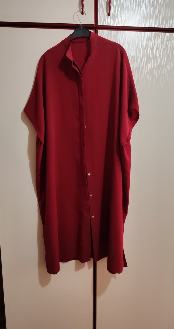 Bordo uzun kesim tesettür tunik, sıfır kollu, sıfır yakalı ve dökümlü, ipeksi kumaştan yapılmıştır, rahat ve şık bir görünüm sunar. Resimdekilerden daha koyu bordo renkte