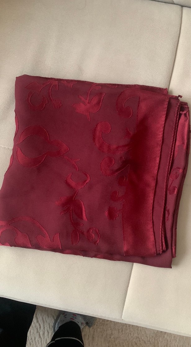 İki kez takıldı yeni gibi sorunsuz 107 cm bir kenarı 105 diğer kenarı çok şık bir eşarp