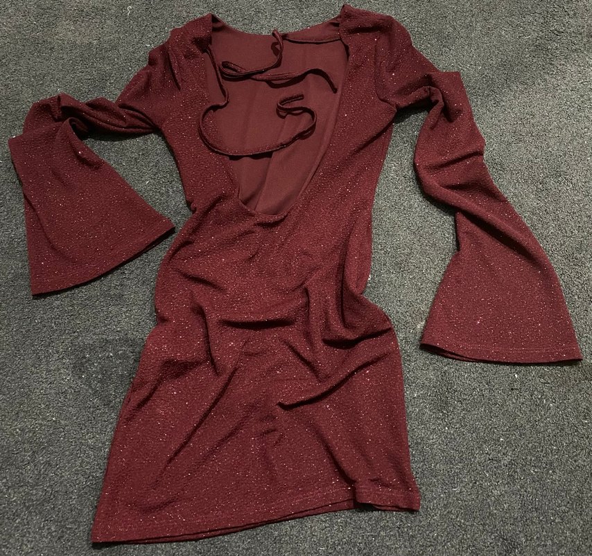 Bordo, parlak kumaşlı, sırt dekolteli ve uzun kollu bu dar kesim abiye elbise,simli tasarımı ve mini göz alıcı bir parti kıyafetidir. ✨