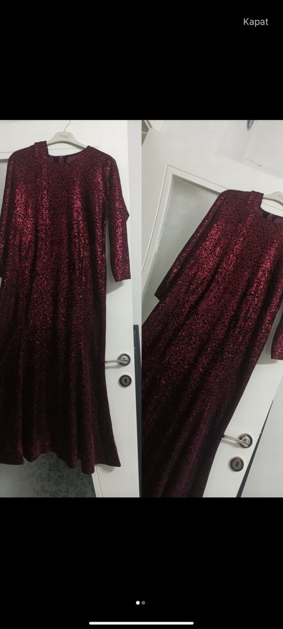 Bordo renkli, simli kumaştan yapılmış, uzun kollu ve V yakalı, bol kesim uzun abiye elbise. Parti için uygundur. ✨ göğüs 58 boy 1 41 kol 49