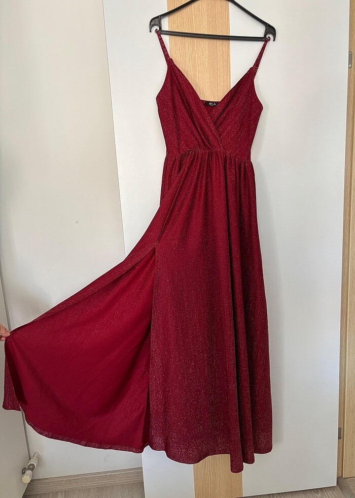 Bordo simli yırtmaçlı abiye
