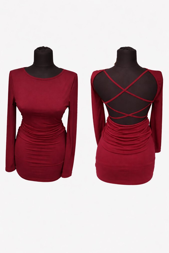 Bordo, vücuda oturan mini elbise, yuvarlak yaka ve uzun kolludur. Sırt kısmında çapraz askılar ve drapeli detaylar bulunur. Romantik akşamlar için idealdir. Sorunsuz
