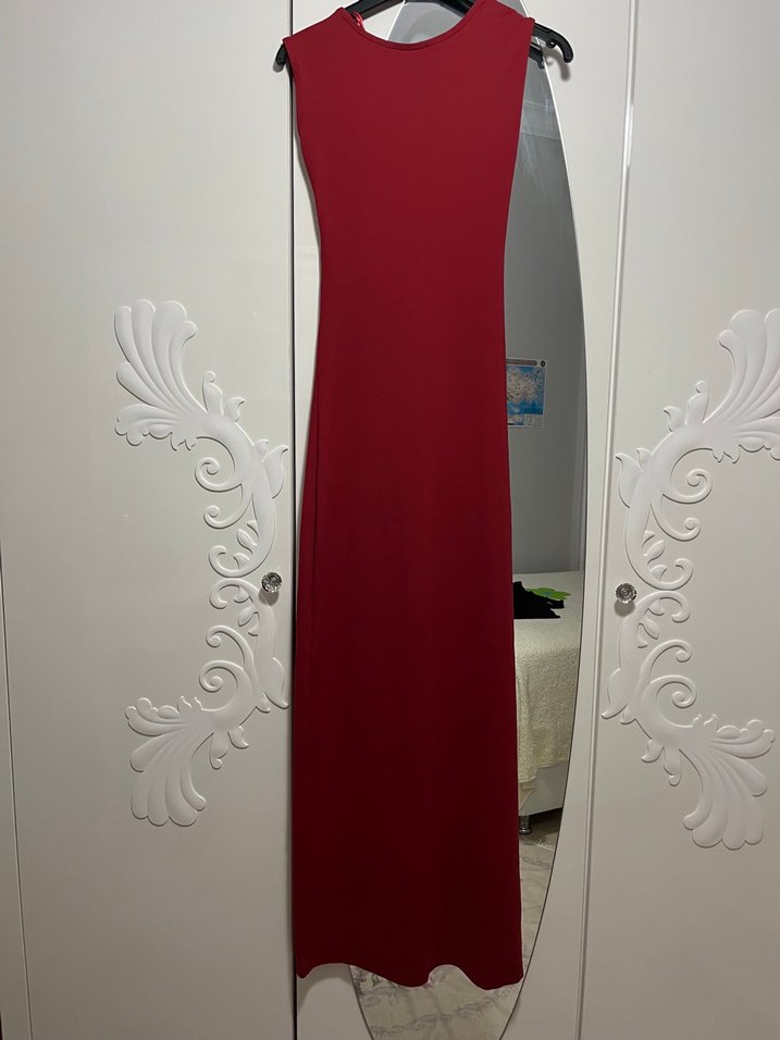 Bordo renkte, sırt dekolteli, kolsuz ve vücuda oturan uzun elbise. Modern klasik tarzda, romantik akşamlar için uygun.