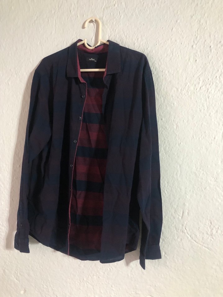 Uzun kollu, yakalı ve bol kesim erkek gömleği. Bordo ve siyah bağlama desenli, düğmeli ön kapamalı, günlük rahat sokak stili için uygun. Pürüzsüz sentetik kumaştan üretilmiştir.