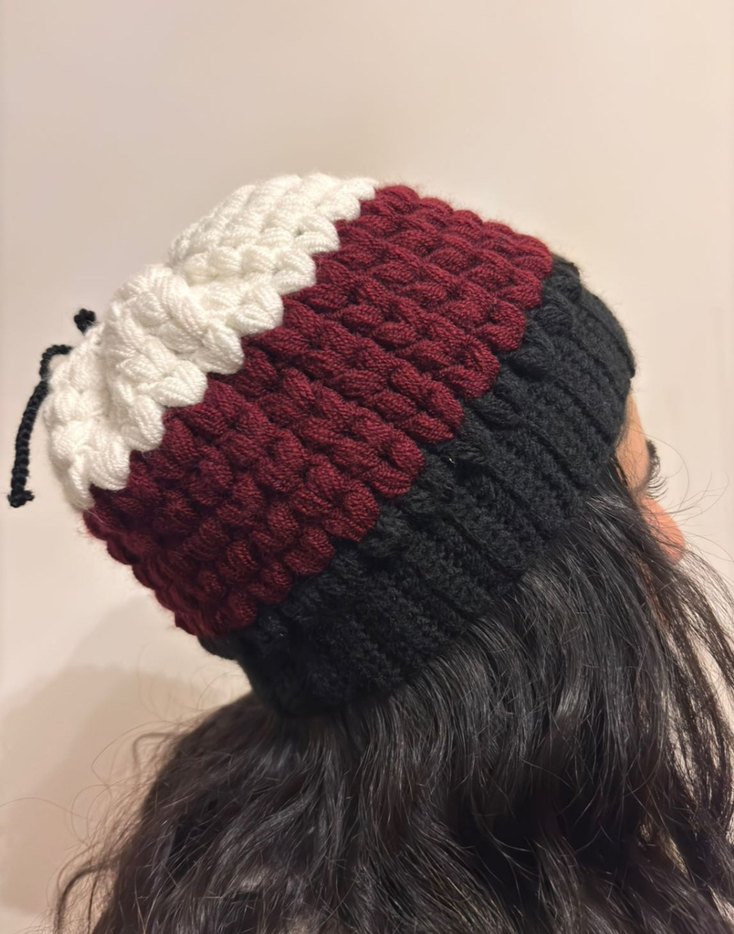 Bordo, siyah ve beyaz renklerde, örgü yapıya sahip, bohem ve retro tarzda kadın bere.