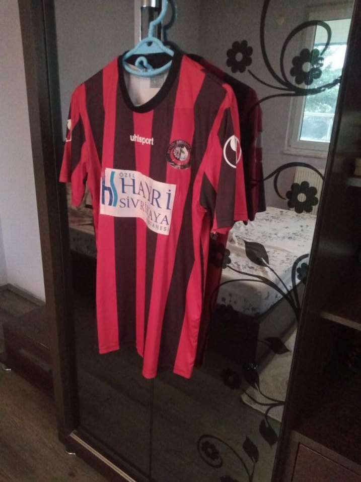 Bordo siyah çizgili, kısa kollu ve bisiklet yaka erkek forma. Sentetik kumaştan, atletik sokak stili ve drapeli detaylara sahip. Üzerinde "AYA, HAYRi" yazısı bulunur.