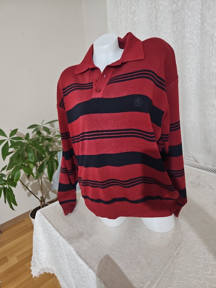 Bu erkek kazağı, uzun kollu, bisiklet yaka ve bol kesim özelliklerine sahiptir. Bordo renkli ve koyu çizgili örgü kumaştan yapılmıştır, günlük sokak stiline uygundur. marka temsili