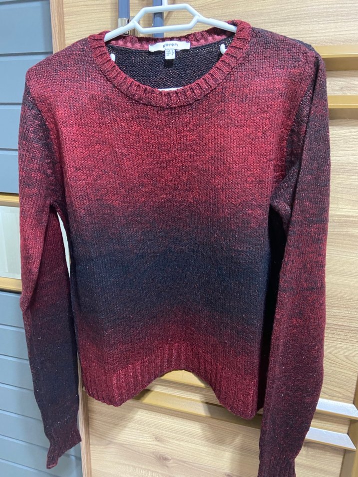 Bordo ve siyah tonlarda degrade desenli, yuvarlak yaka ve uzun kollu örgü kadın kazak. Rahat kesimi ve normal boyu ile günlük kullanıma uygundur.